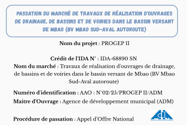 Travaux de rรฉalisation d'ouvrages de drainage, de bassins et de voiries dans le bassin versant de Mbao (BV Mbao Sud-Aval autoroute)