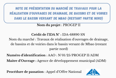 Travaux de rรฉalisation d'ouvrages de drainage, de bassins et de voiries dans le bassin versant de Mbao (restant partie nord)