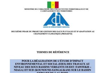 TERMES DE Rร‰Fร‰RENCE POUR LA Rร‰ALISATION DE Lโ€™ร‰TUDE Dโ€™IMPACT ENVIRONNEMENTAL ET SOCIAL (EIES) DES TRAVAUX AU NIVEAU DES SOUS BASSINS VERSANTS OUEST (TAWFEKH โ€“ NIAGA) ET SUD (KOUNOUNE-SANGALKAM) SUR LE BASSIN VERSANT DU LAC ROSE