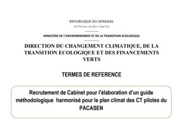 Recrutement de Cabinet pour lโรฉlaboration dโun guide mรฉthodologique harmonisรฉ pour le plan climat des CT pilotes du PACASEN