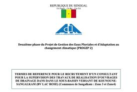 TERMES DE REFERENCE POUR LE RECRUTEMENT Dโ€™UN CONSULTANT POUR LA SUPERVISION DES TRAVAUX DE REALISATION Dโ€™OUVRAGES DE DRAINAGE DANS DANS LE SOUS-BASSIN VERSANT DE KOUNOUNE-SANGALKAM (BV LAC ROSE) (Communes de Sangalkam : Zone 3 et Zone4)