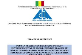TERMES DE Rร‰Fร‰RENCE POUR LA Rร‰ALISATION DE Lโ€™ร‰TUDE Dโ€™IMPACT ENVIRONNEMENTAL ET SOCIAL (EIES) DES TRAVAUX AU NIVEAU DES SOUS BASSINS VERSANTS OUEST (TAWFEKH โ€“ NIAGA) ET SUD (KOUNOUNE-SANGALKAM) SUR LE BASSIN VERSANT DU LAC ROSE
